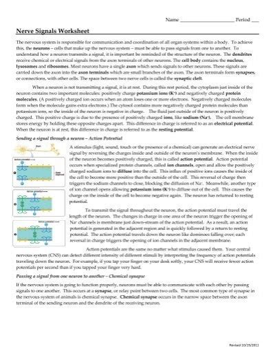 Nerve Signals Worksheet. Web view nerve signals worksheet.pdf from bio 1300 at york university. Explain the difference between the central.