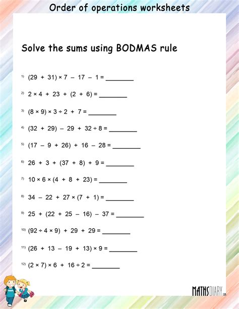 Order Of Operation Math Worksheet. Our grade 5 order of operations worksheets include the use of simple exponents, parenthesis and nested parenthesis. First parenthesis are introduced to addition and subtraction equations.